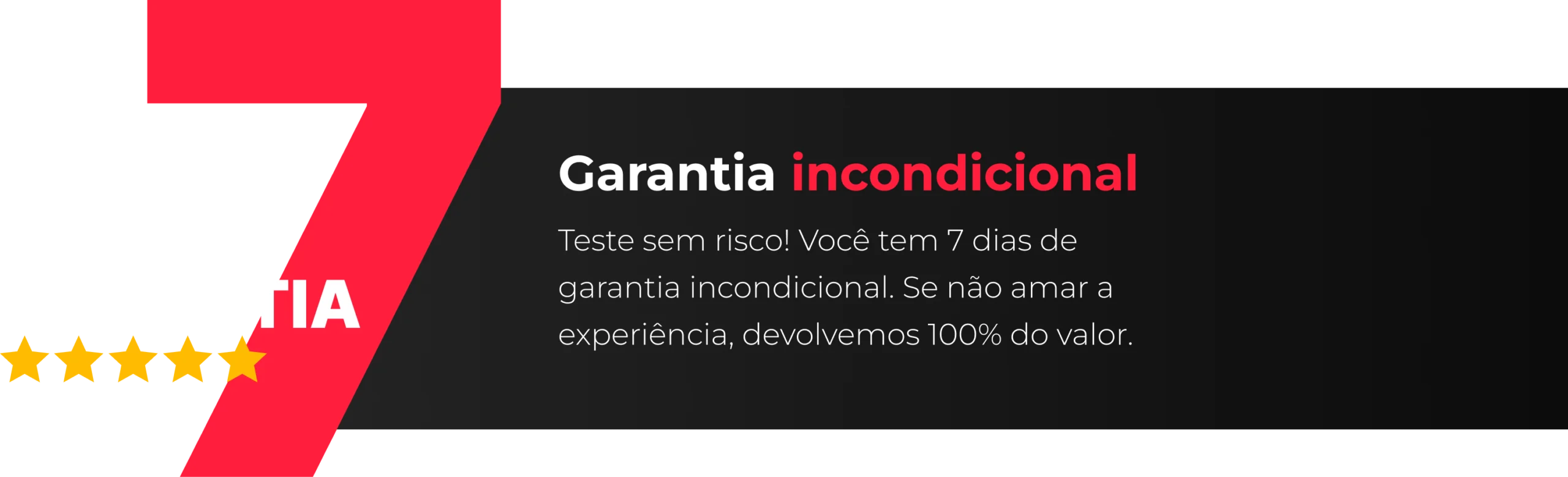 Teste sem risco! Você tem 7 dias de garantia incondicional. Se não amar a experiência, devolvemos 100% do valor.